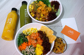 这碗Poke Bowl,我们选择了香蒜米(extra RM2)为底料,泰式椰浆鸡肉(RM12.90)为蛋白质,配搭两种的酱料和4种配料-杏仁、芒果、玉米和海藻沙拉。另外,他们有提供无限量的配料选项,我们也选了芥末、Furikake、蒜米酥、葱油酥、椰子酥和金瓜籽。